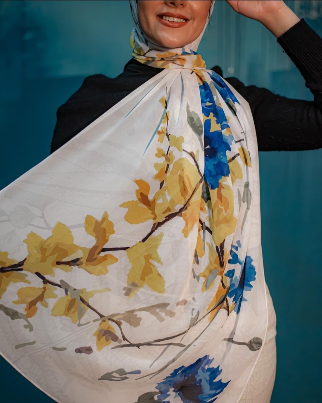 A vibrant hijab featuring a captivating pattern of blue and yellow flowers on a crisp white background. Perfect for adding a touch of spring to any outfit.