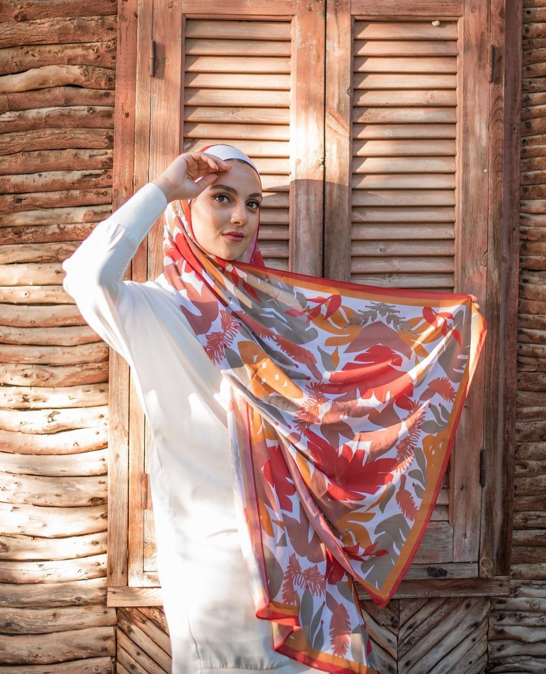 Bold and beautiful, this hijab boasts a vibrant pattern of orange, dusty green, and leafy motifs. Its striking colors create a stunning contrast with any outfit.